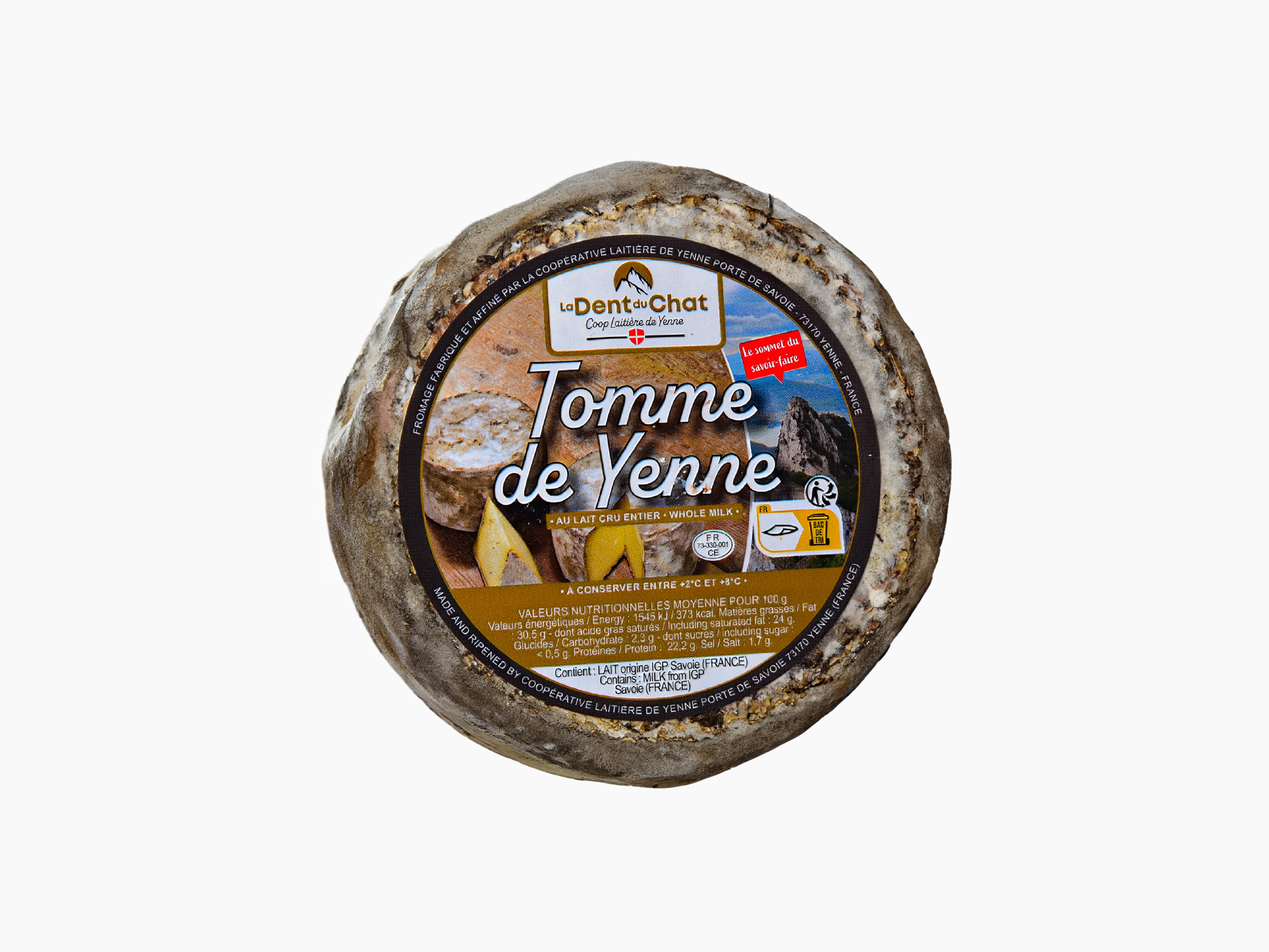 La Tomme de Yenne est un fromage savoyard au lait entier de vache, à pâte pressée non cuite et croûte grise. Présentée en petit cylindre d’environ 800 g, elle offre une texture souple et crémeuse avec 28 % de matières grasses.